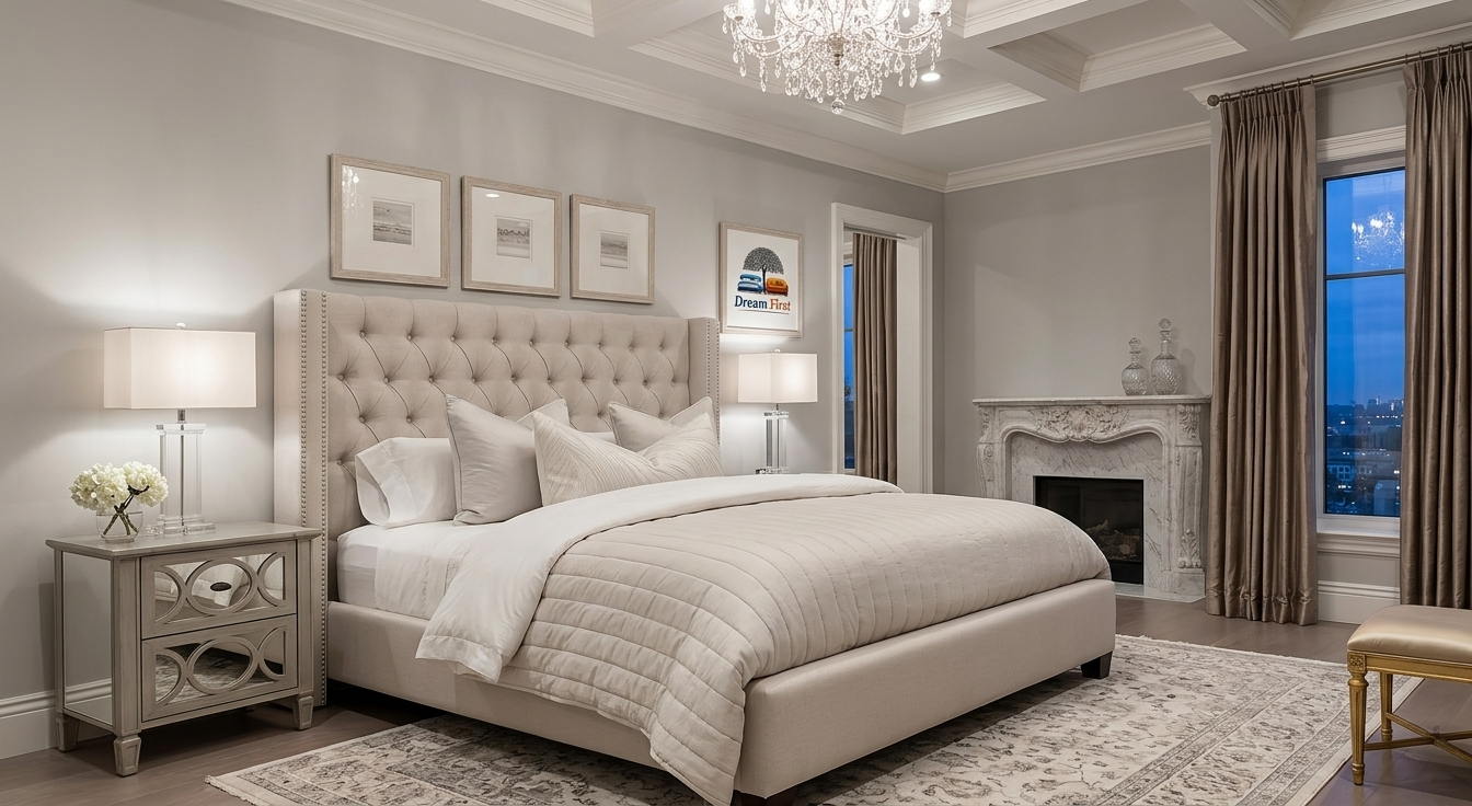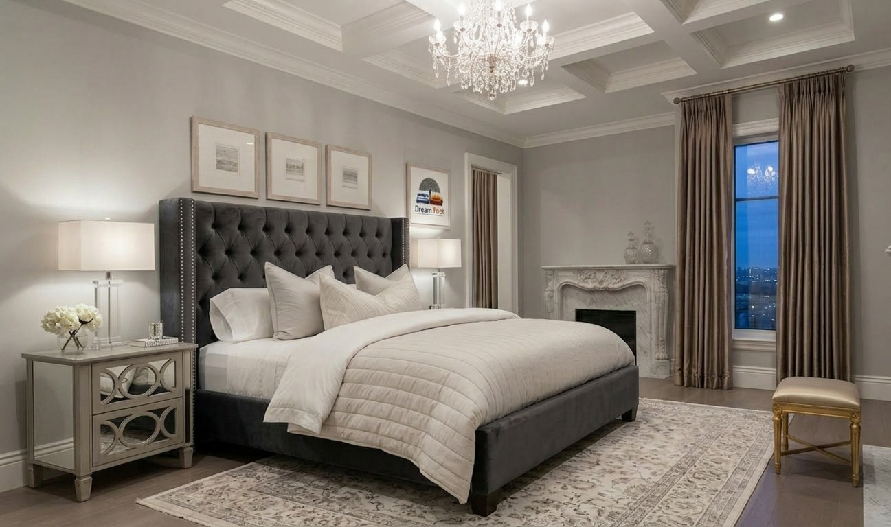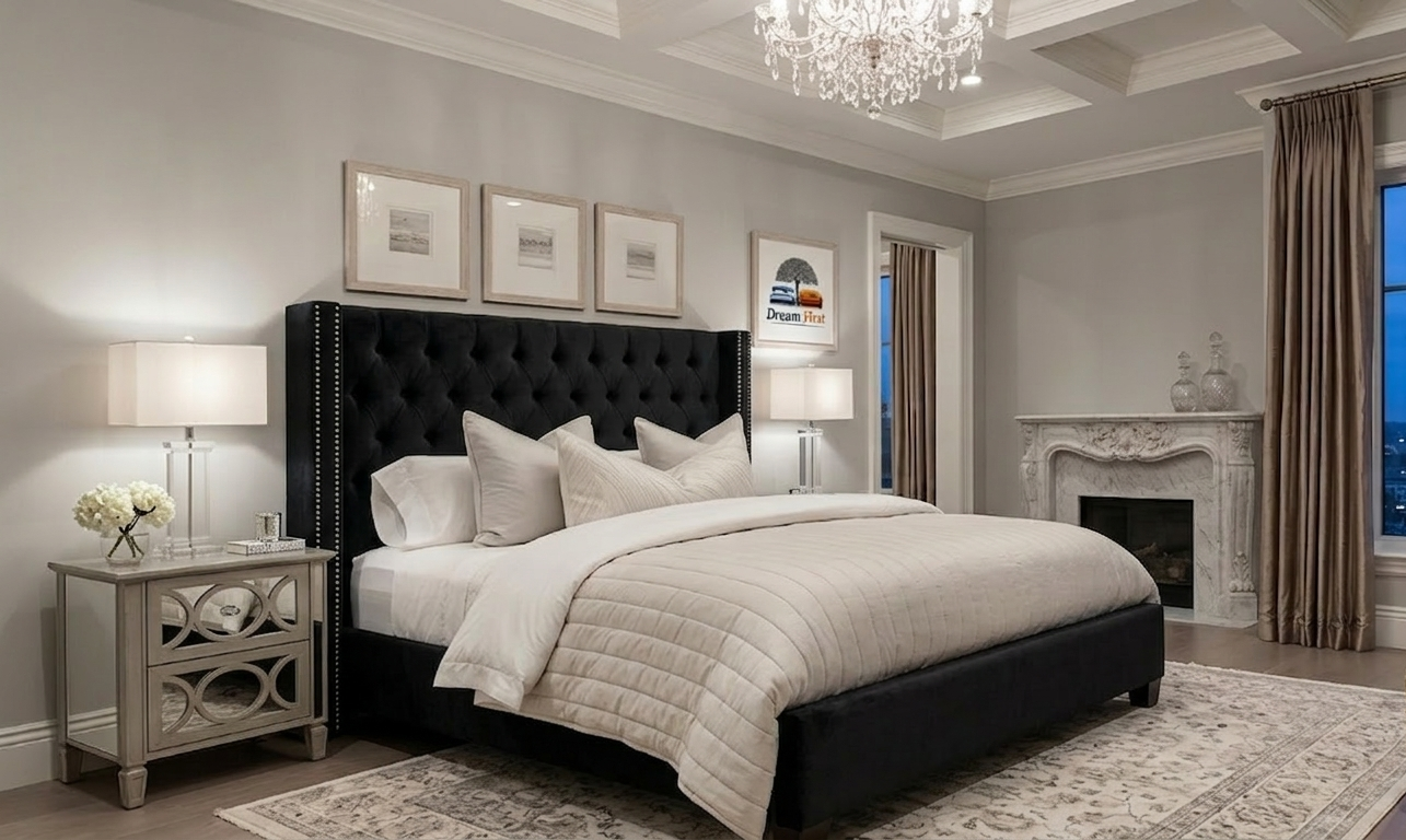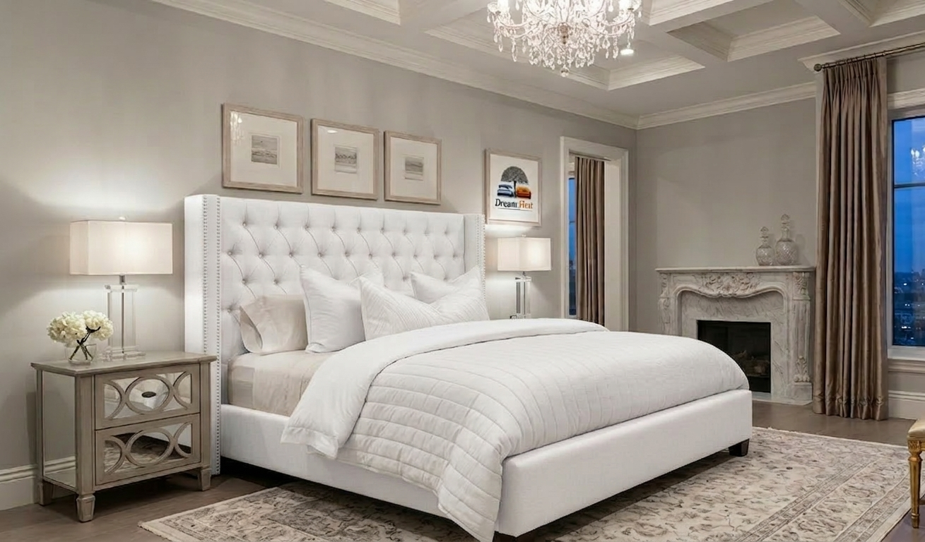 | Headboard Design | Elegant deep button-tufted winged headboard with nailhead detailing |