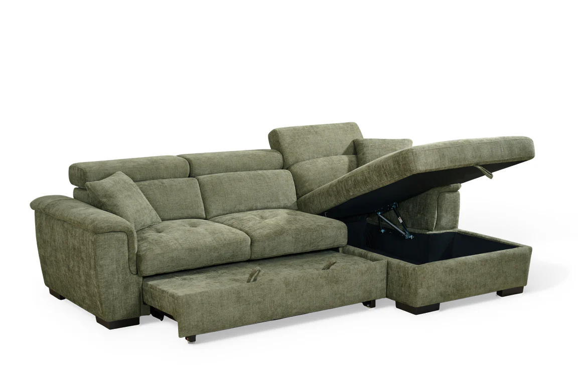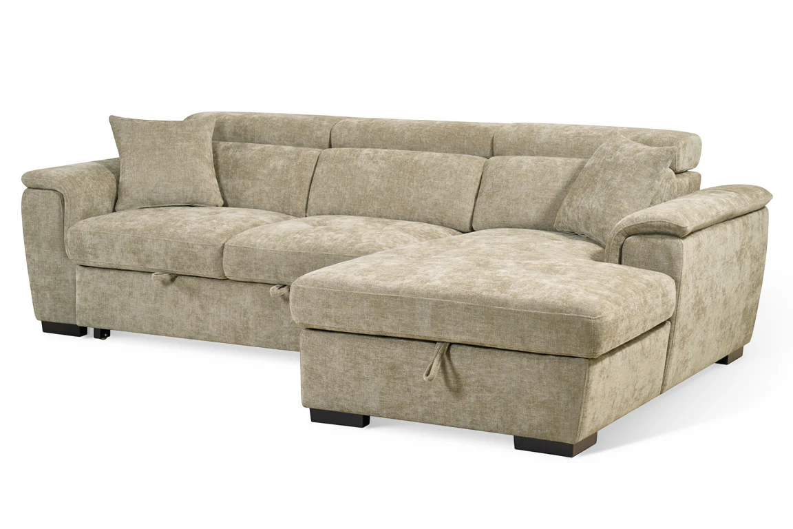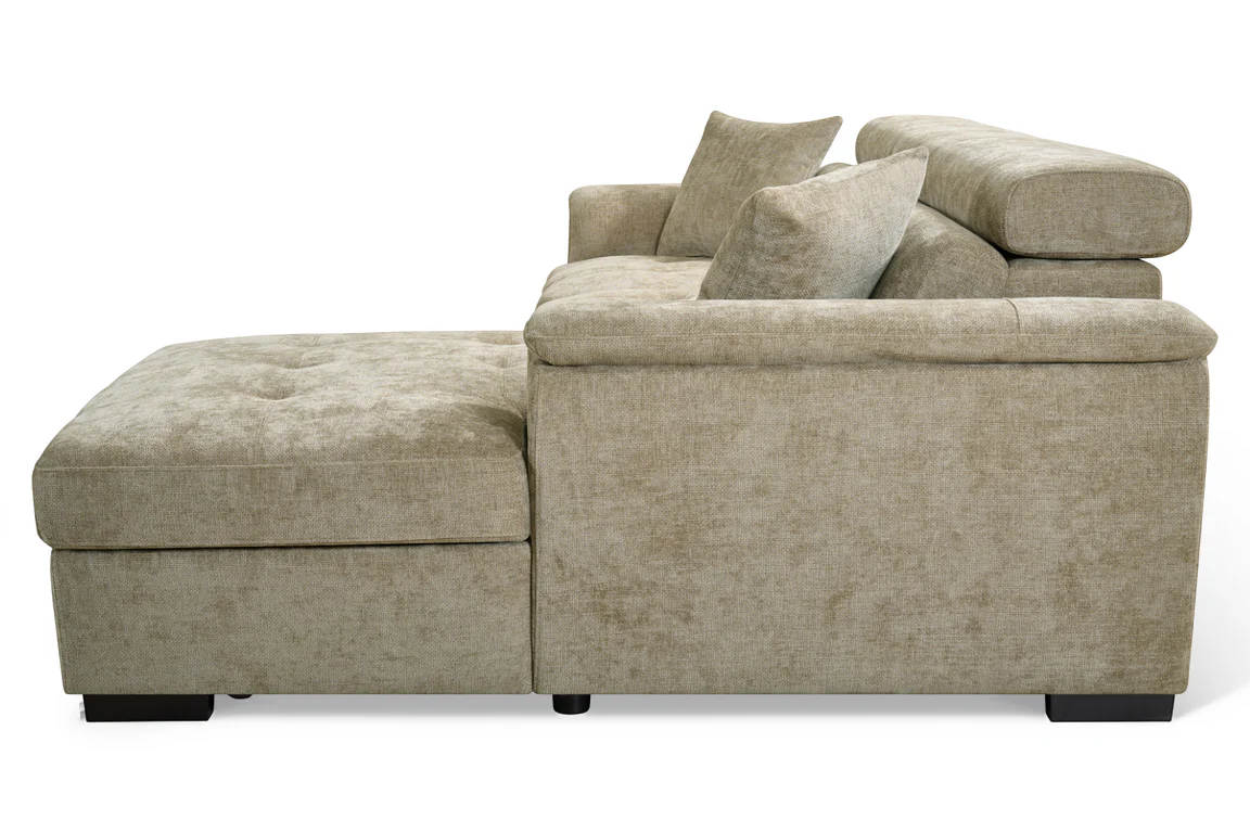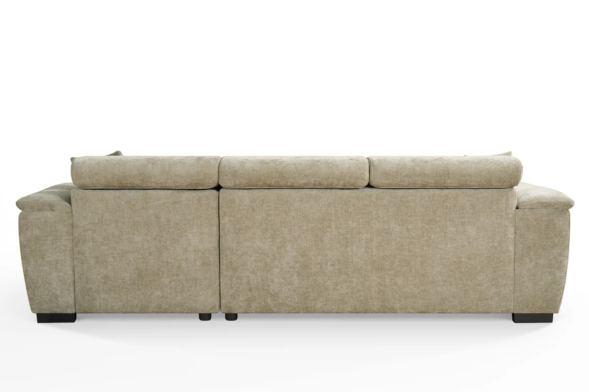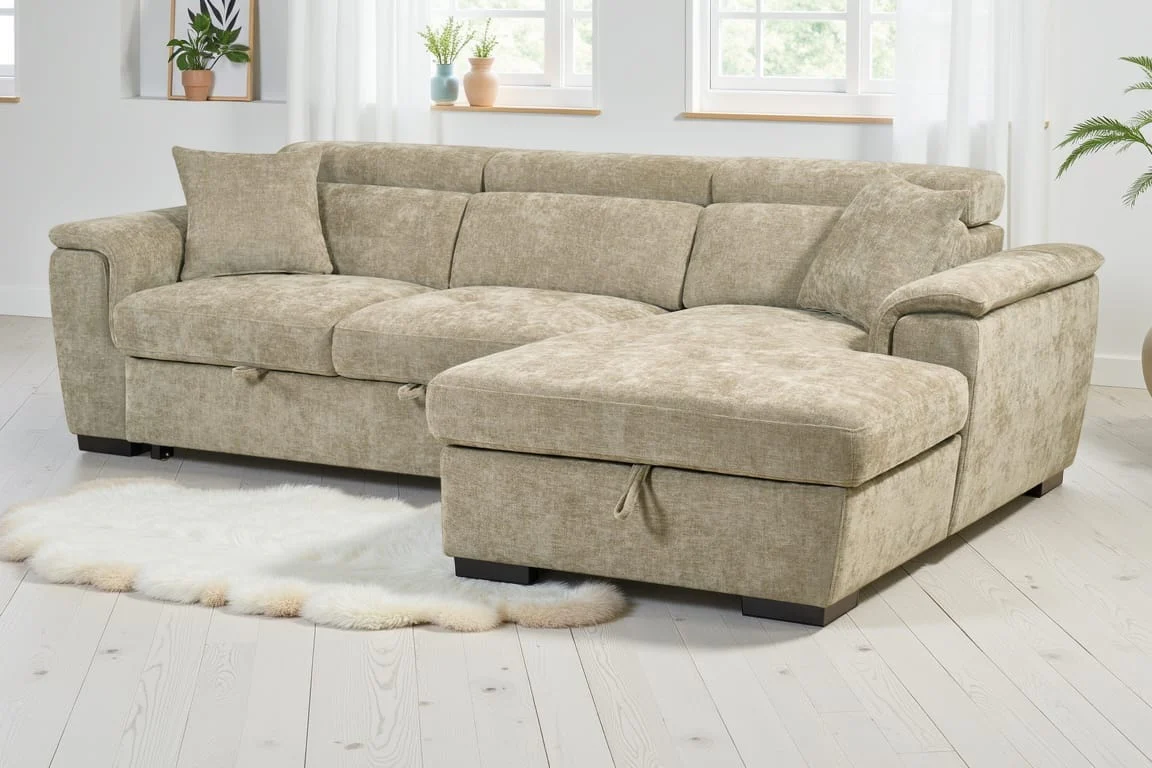 The Beige Chenille Fabric Wilson Corner Sofabed is a space-saving solution, offering seating, sleeping, and storage in one design. Its L-shaped corner layout includes a chaise section that lifts to reveal a concealed storage compartment, ideal for keeping bedding and spare linens close to hand. Converts into a sofabed, suitable for occasional use by guests, or to maximise the use of space in your home. Additionally, the adjustable headrests offer added support for everyday lounging.