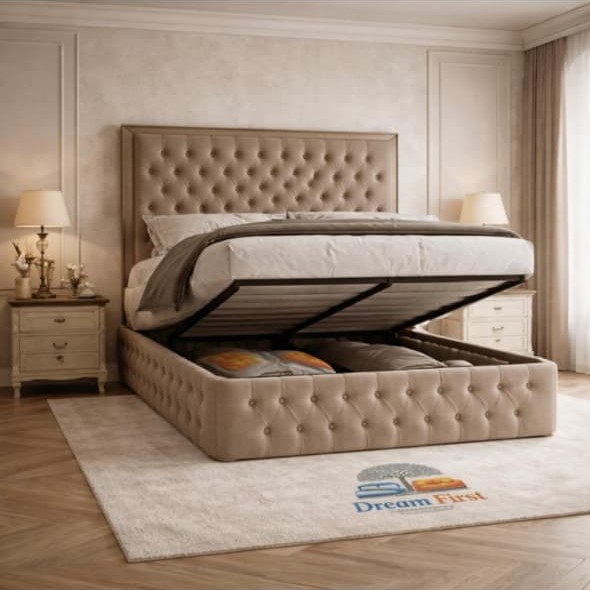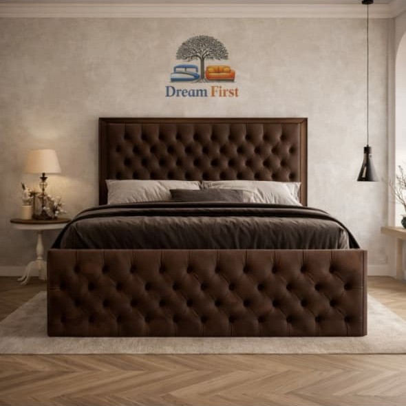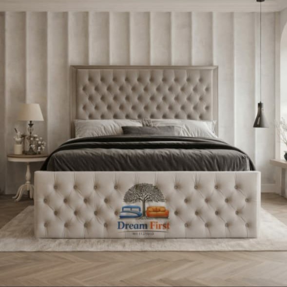 The Chesterfield Bed by DreamFirst features luxurious deep button-tufted upholstery, a grand high headboard, and premium fabric options including velvet, fabric, or leather. Built with a durable solid wood frame and available with optional ottoman storage, it combines timeless elegance with everyday functionality.